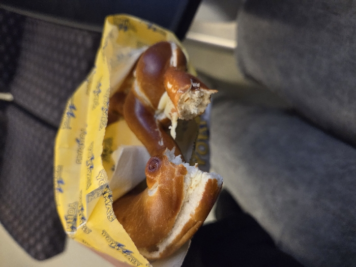 A close-up image shows a partially consumed pretzel sandwich, specifically a "Butterbrezel" with visible white filling, held in a crumpled yellow paper bag. The pretzel is golden-brown and shiny, with a bite taken from its left side and a broken section on the right. The yellow paper bag features repeating blue text, including "YORMAS." A hand with light skin tone holds the bag. Below the hand and pretzel, the upper thighs and knees of a person wearing grey fabric trousers are visible, indicating a seated position. The background above the food shows dark, patterned upholstered seating, consistent with public transport such as a train or bus. Based on the Yorma's branding, which is typically found in German train stations, the environment strongly suggests a train or train station setting. While the exact location within Waghäusel, Germany, is not explicitly shown, the scene is consistent with a journey on a train passing through or stopped at the Waghäusel train station. No other individuals or specific interactions are depicted.