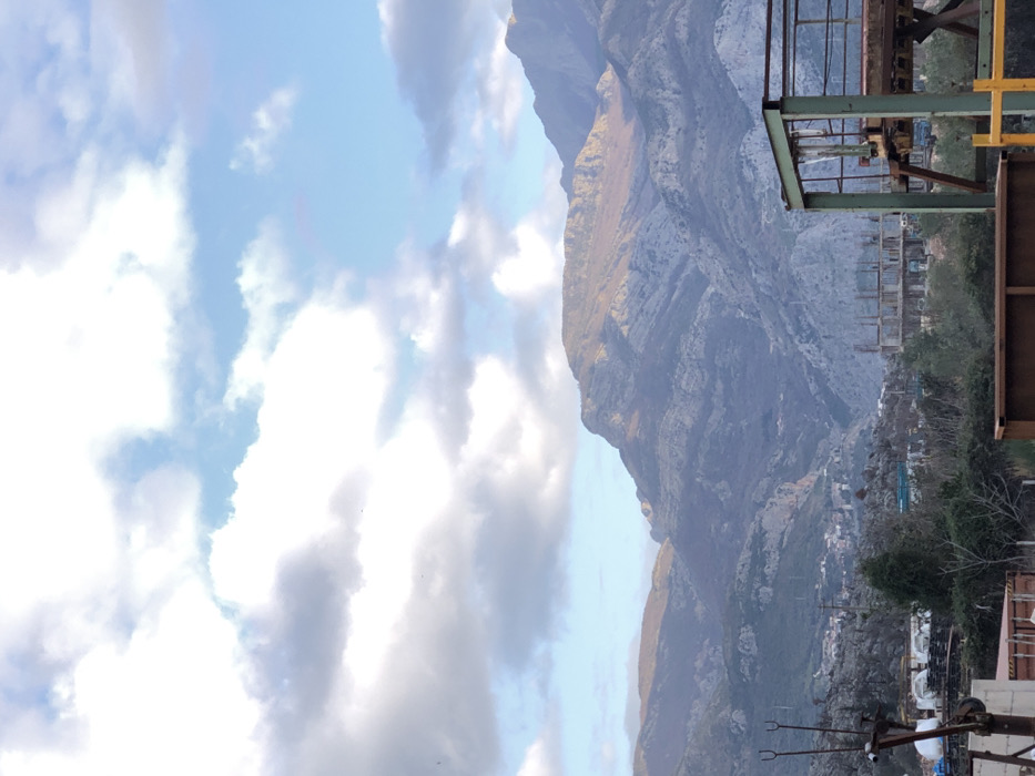 A tall mountain dominates the scene, with visible layers and varying shades of gray and brown. Patches of green vegetation speckle its lower slopes. In the sky, white and gray clouds fill a blue expanse. The foreground features indistinct shapes, possibly structures, with glimpses of green vegetation and hints of a settlement nestled beneath the mountain.