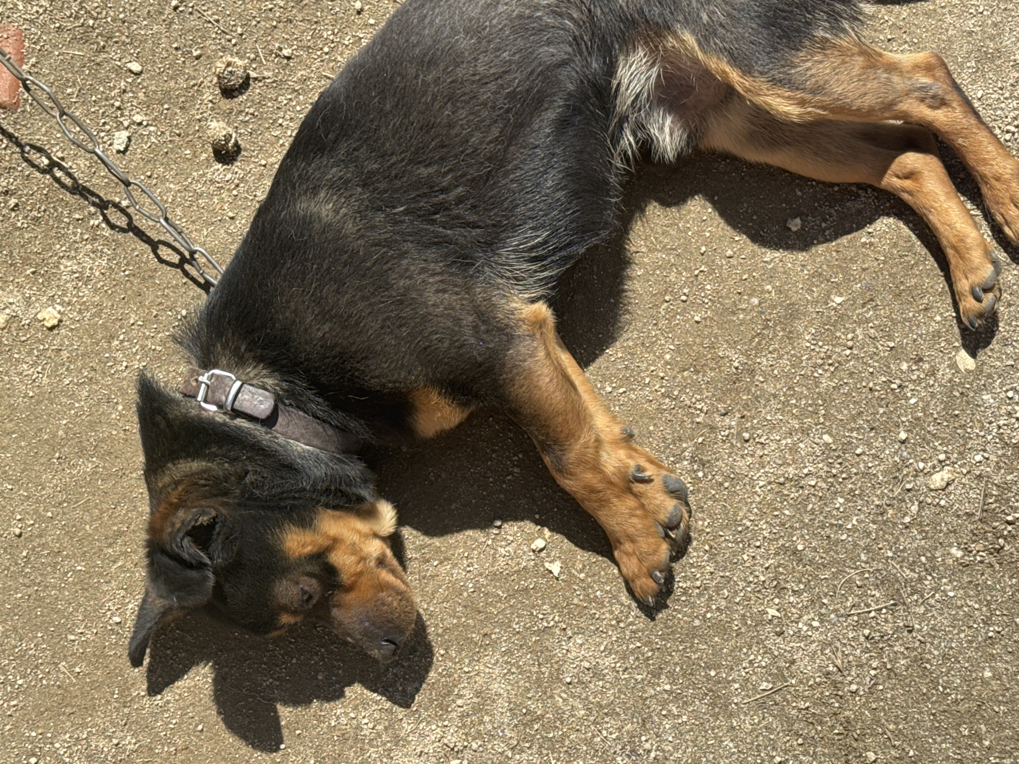 - "A medium-sized dog, with black and tan fur, lies on the ground" by FM-tZgMG3, licensed under CC BY 4.0