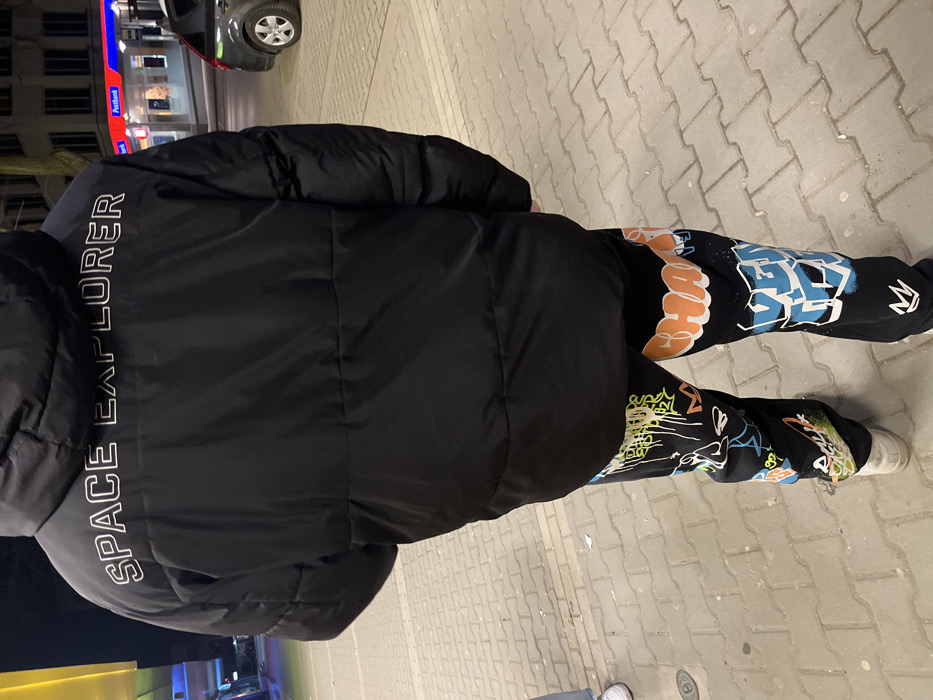 The image captures an individual standing with their back to the viewer on a paved sidewalk in Silistra, Bulgaria, during nighttime. The person is wearing a black padded jacket with a hood, featuring the white text "SPACE EXPLORER" across the upper back. Their lower body is clad in black trousers heavily decorated with multi-colored graffiti-style graphics, including prominent orange block letters spelling "CHAOS" on the right leg and blue block letters on the lower left leg. White sneakers are visible on their feet. The sidewalk is constructed from light grey rectangular pavers. To the far left, the lower legs and white shoes of another person are partially visible. In the background to the left, a yellow illuminated structure is present. To the right, a "Postbank" branch is visible with a red facade and blue overhead signage, illuminated by internal lights. A dark-colored SUV is parked in front of the bank. The entire scene is illuminated by artificial street lighting.