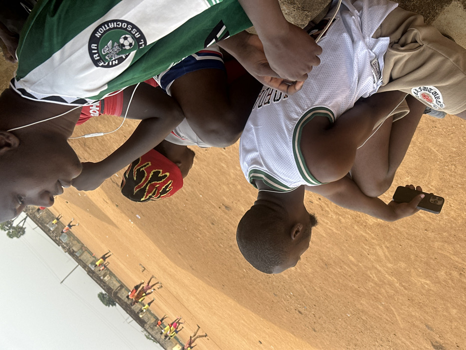 This image depicts a scene at a reddish-brown dirt field in Television, Nigeria, where several individuals are engaged in outdoor activities