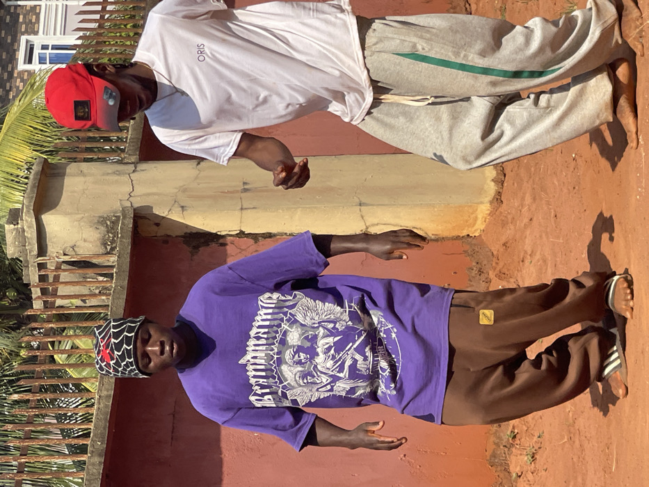 The scene is an outdoor setting in Neni, Nigeria, under direct sunlight, casting distinct shadows on reddish-brown dirt. Two males of African descent are depicted. The individual on the left wears a black beanie with a white spiderweb pattern and a red spider, an oversized purple t-shirt featuring "BRANDNAME" text above a graphic of three winged figures, two of whom are holding what appear to be firearms, and brown baggy sweatpants with a yellow square patch on the right thigh. He wears white and black Adidas slides on his feet. His posture indicates slightly bent knees, and his gaze is directed downwards. The individual on the right wears a red baseball cap, a white t-shirt with "ORIS" printed on the left chest area, and grey baggy sweatpants with a vertical green stripe down the outer side of each leg. He is barefoot. His body is angled, with his right leg bent forward and right arm slightly raised, suggesting a dynamic pose or mid-step, and his head is tilted downwards. The background consists of a weathered terracotta-colored wall with a vertical crack or seam, topped by a rusted metal fence. Behind the fence, green palm fronds and a portion of a light-colored building with dark windows are visible.
