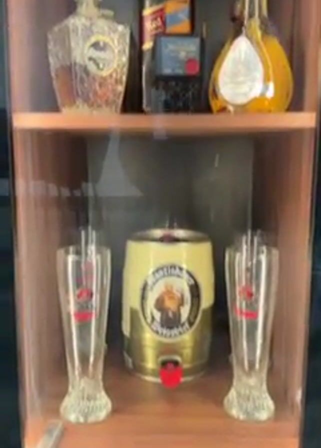 tall, wooden display case with glass shelves filled with glassware and liquor. The top shelf contains three bottles of liquor. The second shelf holds a small keg of beer and two beer glasses. The rest of the shelves contain various crystal glasses and a pitcher. The display case is built into a wall with dark cabinets and a staircase visible in the background.