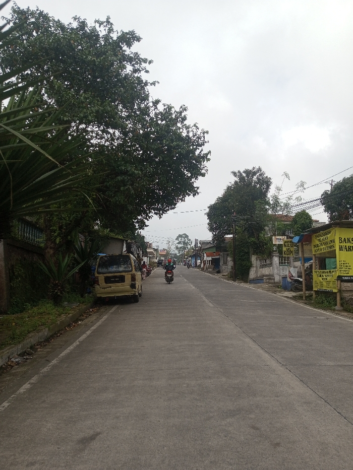 A long, straight, concrete road stretches into the distance, lined with trees and buildings. A yellow van is parked on the left side of the road, near lush foliage. A motorcycle travels down the center. Signage hangs on a building on the right. The sky is overcast.