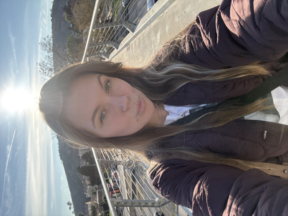 A female subject is depicted in a self-portrait taken on a pedestrian bridge in Sutomore, Montenegro