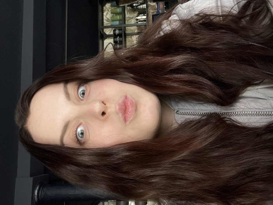 A female subject with long, dark brown wavy hair and fair skin is depicted in a close-up, frontal self-portrait