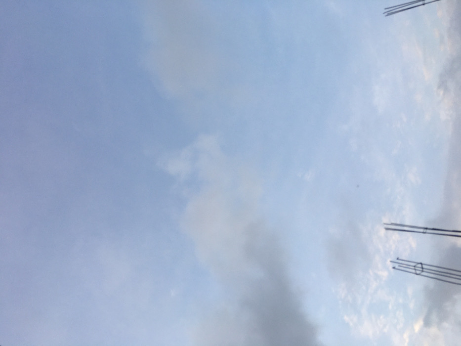The scene, located in Agunmo, Nigeria, features a partially cloudy sky. The upper and central areas display a light blue sky interspersed with diffuse white clouds. Towards the lower left, denser grey cloud formations are present. The extreme bottom edge of the image reveals the upper portions of three separate vertical rebar bundles, consistent with structural elements of a building under construction. No people, actions, or interactions are discernible.