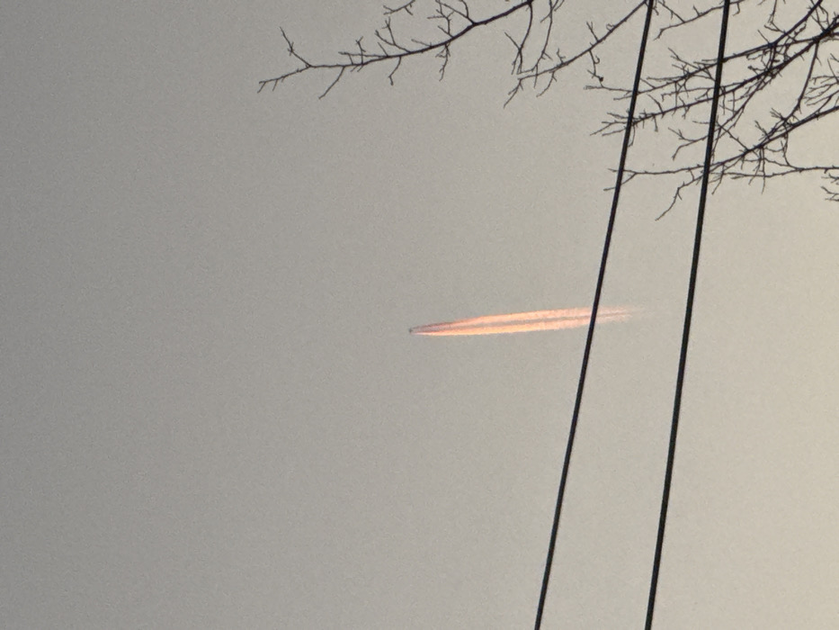 The image displays an outdoor scene in Armavir, Armenia, featuring a high-altitude aircraft and its contrail against a light gray, hazy sky. A single aircraft, appearing as a dark, small speck, is visible at the apex of a prominent, vertically ascending contrail. The contrail is elongated, straight, and exhibits a distinct orange and reddish coloration, suggesting reflection from a low-angle sun. Two dark, parallel utility wires extend horizontally across the lower half of the frame. Bare, dark tree branches with fine twigs are visible on the right side of the image, partially obscuring the sky. No individuals or specific actions are discernible.