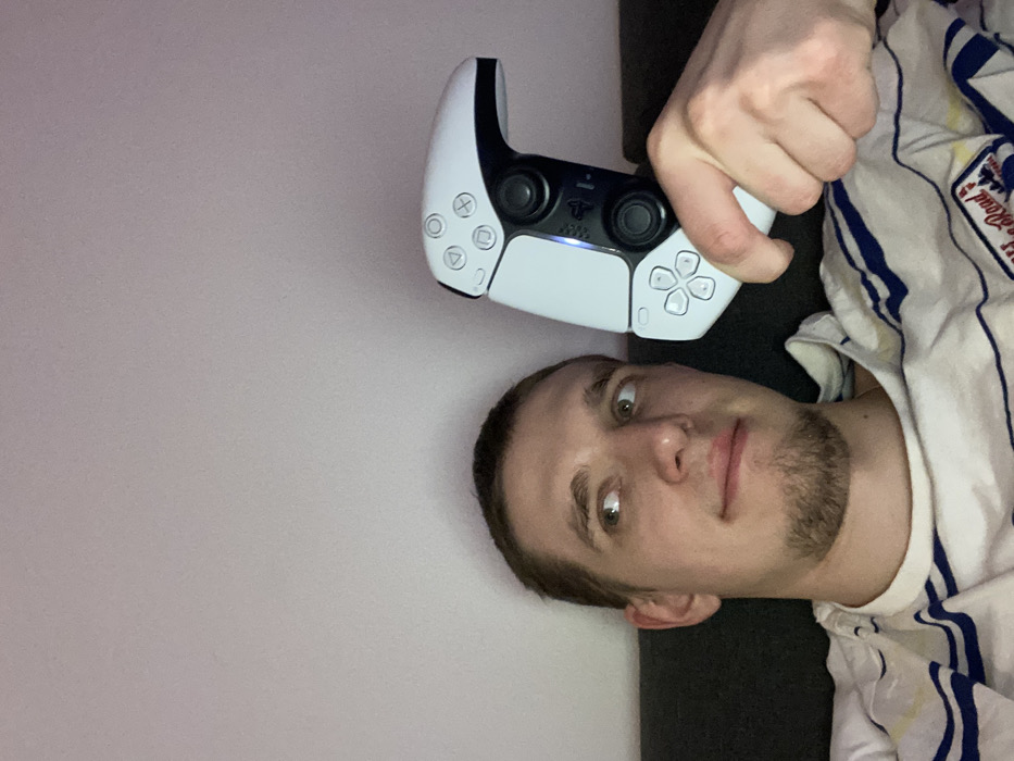 - "A man lies on his side, holding a white PlayStation 5 controller above his head" by FM-7QVgb2, licensed under CC BY 4.0