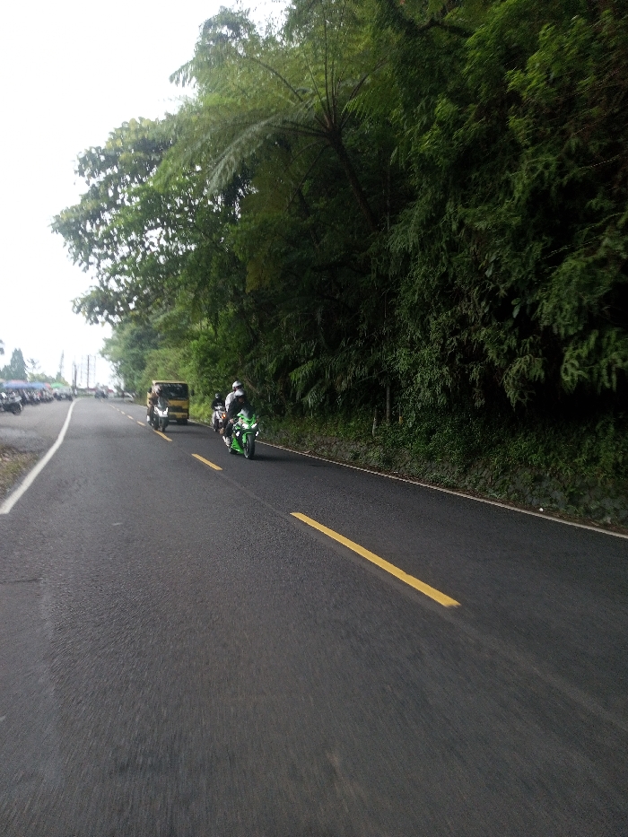 A paved road stretches into the distance, a blurred yellow line marking its center. Two motorcycles are traveling along the road, following a small truck. Lush, dense vegetation lines the right side of the road, creating a wall of green. A collection of parked vehicles is visible on the left, indicating a potential gathering or parking area. The sky is overcast, suggesting a muted or cloudy day.