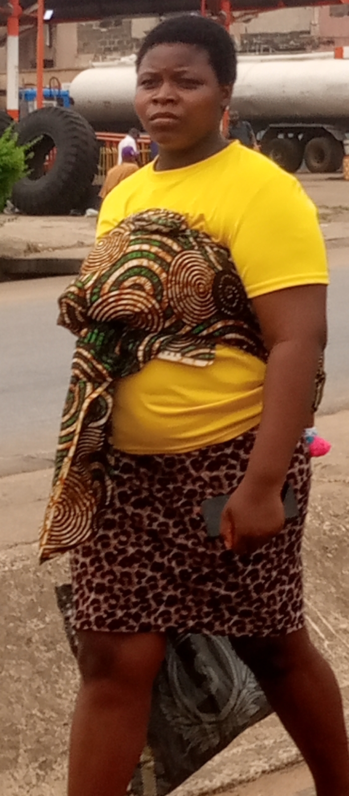 An individual with dark skin and short, dark hair stands outdoors in Awkuzu, Nigeria. This person is wearing a plain yellow t-shirt and a brown leopard-print skirt. A patterned fabric, featuring brown, green, and white circular designs, is draped over the individual's left shoulder and torso. A dark-colored smartphone is held in the right hand, positioned at the side. A small pink and white object is visible near the right hip, possibly tucked into the skirt or fabric. The individual faces forward with a neutral expression. In the foreground, a gray and black object or bag is partially visible on the ground near the individual's feet. The immediate background shows a road surface and a light-colored curb. Further back, a large black industrial tire is prominent on the left. To the right of the tire, a large white cylindrical tank, consistent with a tanker trailer, is visible. Multiple blurry figures are discernible in the mid-background. Structures and buildings are present in the far background.