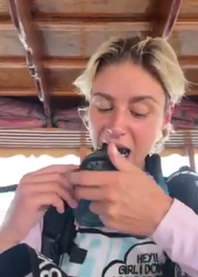 A woman with short blonde hair is sitting down wearing a scuba diving vest. She has a scuba mask around her neck. The woman has a black scuba diving regulator in her hands. She puts the regulator in her mouth, takes a deep breath, and then takes it out of her mouth. The video appears to be filmed on a boat, as wooden roofing can be seen above the woman. The boat motor is heard in the background.