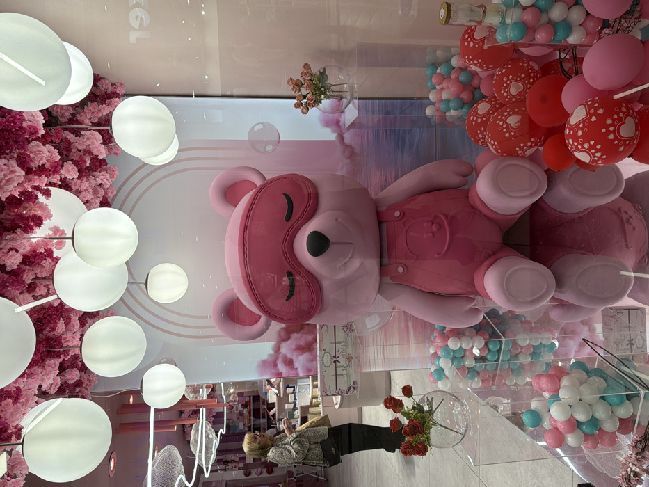 The image depicts a retail display window located in a commercial area of Sofia, Bulgaria. The central subject is a large, light pink, seated teddy bear wearing a dark pink sleeping mask over its closed eyes and dark pink overalls with a circular emblem on the chest. The bear rests on a reflective pink surface. To the left of the bear, a clear glass sphere vase holds several red artificial roses with green stems. Below and to the left of this vase, a clear acrylic container is filled with numerous small, spherical decorative balls in white, pink, and light blue. To the right of the bear, a collection of red and pink balloons, some patterned with white hearts, are arranged. Adjacent to the balloons, additional white, pink, and light blue spherical balls are visible inside clear cylindrical vessels. The background inside the store, viewed through the display glass, features a ceiling adorned with numerous light pink artificial flowers, interspersed with multiple white spherical pendant lights of varying sizes. A large pastel-colored graphic resembling a dreamy landscape with pink clouds and water is positioned directly behind the teddy bear. An adult female with light-colored hair, wearing a patterned top and dark trousers, is partially visible on the left side of the image, inside the store. She holds a small, clear glass or cup and a light-colored bag, and appears to be looking towards the left. Reflections of the store interior, including the inverted text "19X" on the upper right, are visible on the display glass. The overall environment is brightly lit and presents a coordinated pink and white aesthetic.