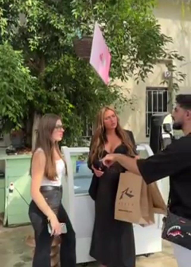 Three people are standing outside, presumably at an eatery or shop. Two women are on the left side of the frame. The woman closest to the camera is younger, wearing a white top, black pants, and sandals. She has long brown hair and is holding a phone. The other woman is wearing a black dress and a black blazer, with platform heels. Her long hair is blonde. Both women are looking towards a man on the right side of the frame. He is holding two brown shopping bags with the logo "Rusty" visible. He is wearing a black shirt, white pants, and a crossbody bag. A white ice cream freezer is between the women. Behind them, there is a green-painted building, a large tree, and a pink sign hanging overhead. The scene appears to be in daylight.