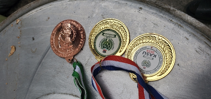 The scene is located in the city of Narayi, Nigeria. Three sports medals are arranged on a weathered, gray, textured surface, possibly concrete or a metallic table. The surface shows minor scuffs and scattered light brown debris, consistent with dried leaf fragments or small dirt particles. One bronze-colored medal is positioned at the top, equipped with a green and white striped ribbon. Its circular face features an embossed design, including what appears to be a crest or emblem surrounded by text, partially obscured. Below and to the left of the bronze medal are two gold-colored medals, both attached to red, white, and blue striped ribbons. The top gold medal displays a central green and white crest-like emblem within a white circle, framed by a detailed golden laurel wreath pattern. The lower gold medal, partially overlapped by the upper one, also exhibits a golden laurel wreath border. Its central white disc clearly reads "INTER TERTIARY INSTITUTIONS GAMES" arcing around the top, "KASU 2024" prominently in the center, and "KADUNA METRO" arcing around the bottom, alongside a smaller crest or logo. A dark, indistinct object, possibly the toe of a shoe, is visible in the lower right corner of the frame.