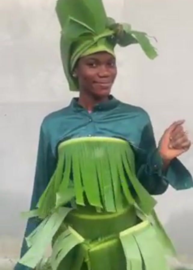young woman standing outdoors. She is wearing a green satin top, a green satin skirt, and green satin gloves. She also has a headpiece that is made of green leaves. She is smiling and posing for the camera. The background is a plain, light-colored wall and some grass.