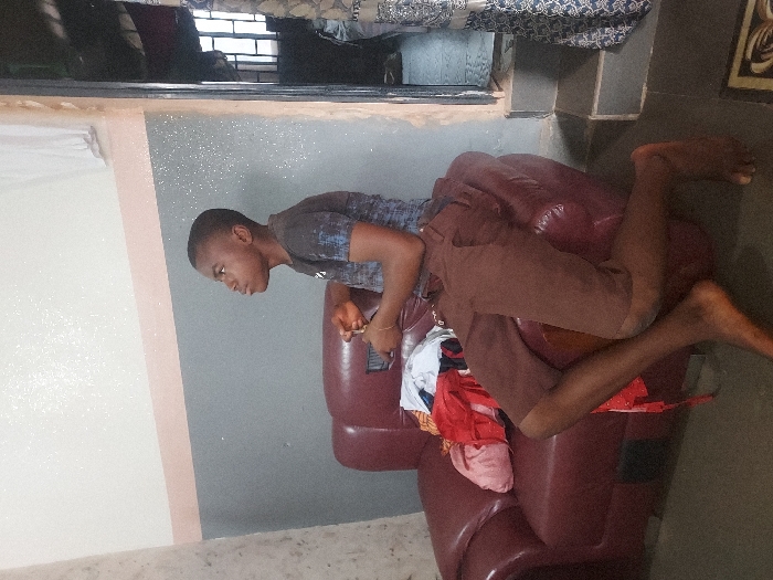 A young male, appearing to be in his late teens, is seated barefoot on a large, reddish-brown, possibly faux leather, sofa within an indoor residential setting. He wears a dark, patterned short-sleeved t-shirt and dark brown shorts. His head is turned to his left, and his gaze is directed upwards. His right hand is raised near his mouth/chin, holding a small, light-colored object. A pile of multi-colored clothing, including red and white garments, rests on the sofa to his immediate left. The room's wall features a dark grey lower section, a light peach horizontal stripe, and a white upper section. To the right, a dark-framed doorway opens to another area, revealing a set of dark steps, a patterned curtain, and a window with vertical bars. The floor is a dark, solid color. The specific location within "Unknown, Unknown" is not ascertainable from the image.