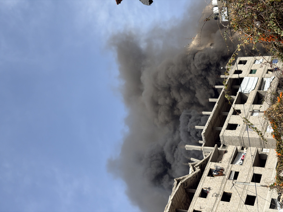 - "A large plume of dark grey to black smoke billows upwards and outwards, originating from a structure mostly obscured from view, under a clear blue sky with minimal cloud cover, in Gaza City, Palestinian Territory" by FM-PSI0J3, licensed under CC BY 4.0