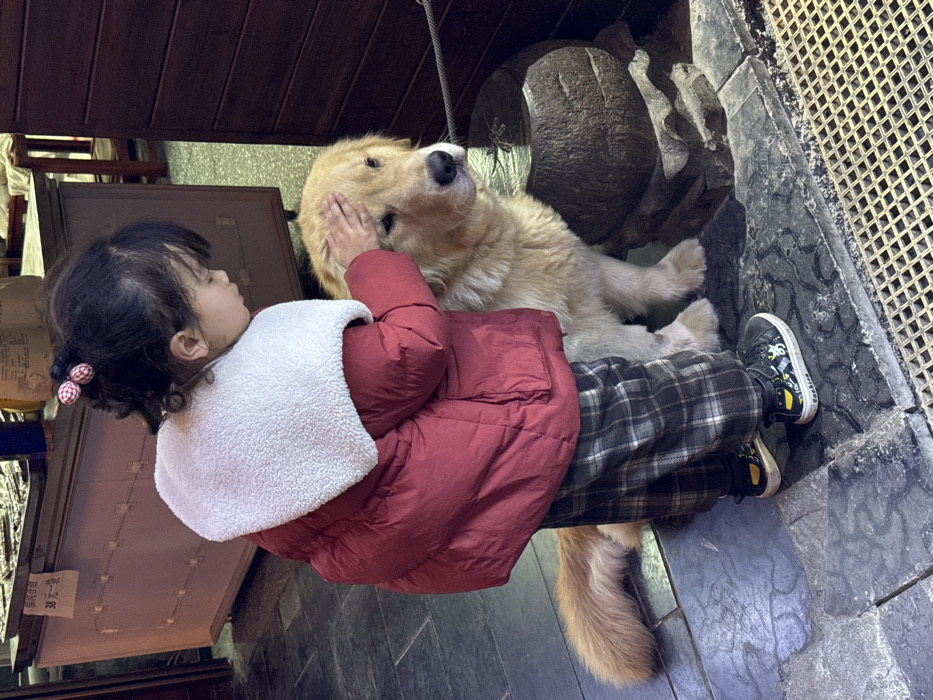 - "A young child, observed from behind, stands interacting with a golden retriever dog in an interior setting within the city of Furong, China" by FM-7eaFY2, licensed under CC BY 4.0