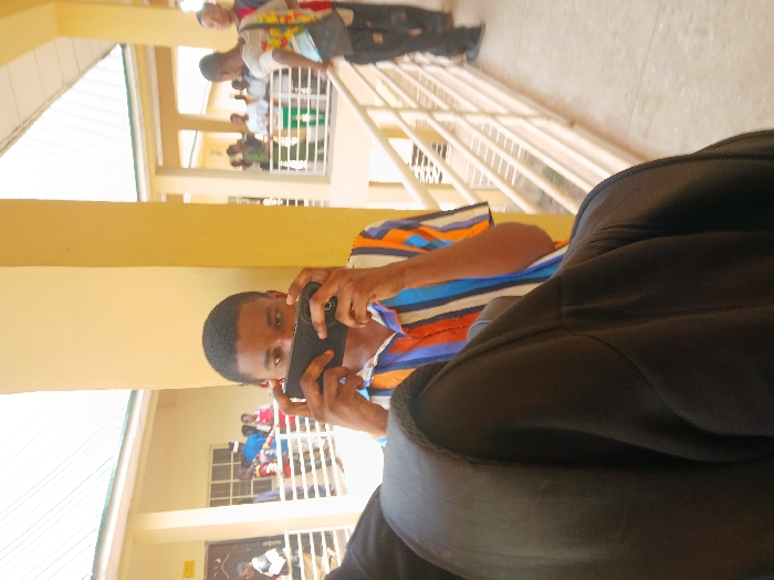 The image depicts a daytime scene within a multi-story building complex in Ugi Majowel, Nigeria. The architecture features light-yellow painted walls and pillars, white metal railings, and a light-colored sloped roof. In the foreground, the left shoulder and upper back of an unidentified individual, wearing a dark-colored garment, partially obscure the lower left quadrant of the frame. Centrally positioned behind this obstruction, a young male subject, likely in his late teens or early twenties, holds a black smartphone horizontally at eye level with both hands, appearing to record or photograph. He has short dark hair and wears a horizontally striped short-sleeved shirt with blue, white, and orange segments. His eyes are focused forward, visible above the phone. To the subject's right, a prominent light-yellow structural pillar stands. Beyond this pillar and to the right, a walkway with white metal railings extends into the background. Several other individuals are visible on this walkway; one young male with a backpack is leaning on the railing, looking towards the left. Additional figures are observed further along the walkway and in a background structure to the left, which has windows and doorways, also featuring railings and visible occupants. The lighting suggests an outdoor or semi-outdoor environment under natural light.