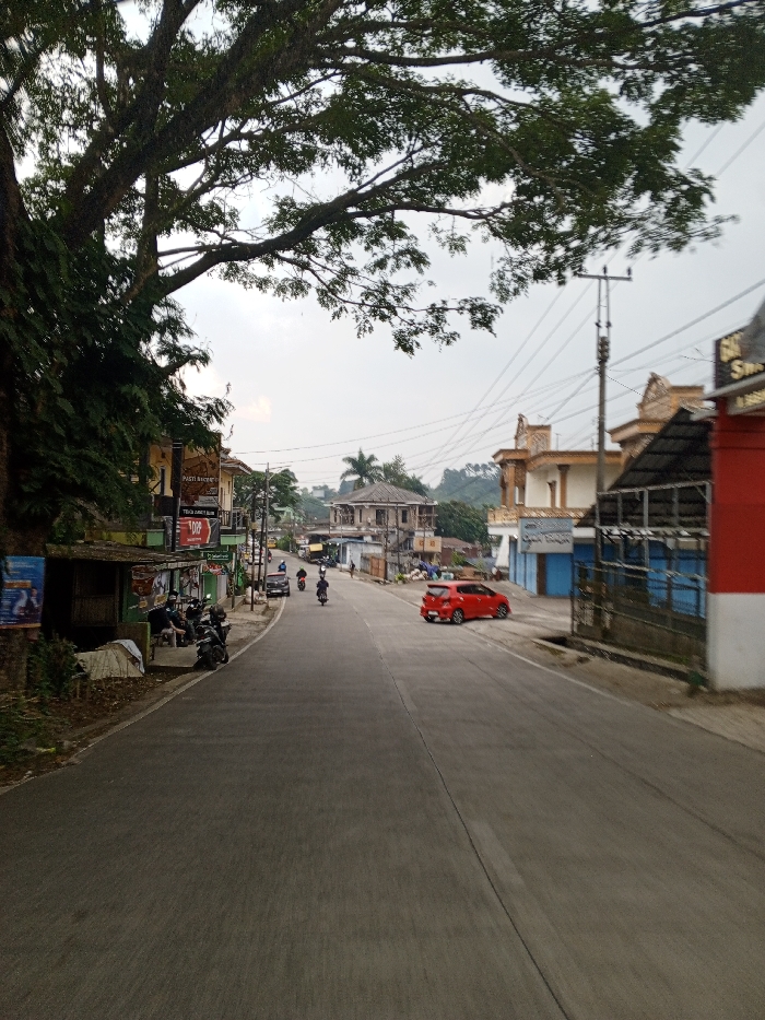 The scene depicts a street in Kheda, India, under an overcast sky. A two-lane asphalt road, with a faint white center line, extends into the distance with a slight right curve. On the left, a large tree with extensive green foliage dominates the foreground, its trunk partially visible. Below the tree, a series of low-rise commercial buildings line the road, displaying signage such as "PASTI ENAK!", "MIE DRP", and "TEH JAV". Approximately six motorcycles are parked along the dirt shoulder in front of these buildings, where three to four individuals are present, seated or standing. On the right side, a red and white striped structure is partially visible in the immediate foreground. Further down the road on the right, a light-colored building with ornate brown architectural elements and closed blue shutters is present, followed by a grey-roofed building. Power poles with numerous overhead wires run along this side. A red five-door hatchback is parked facing away from the viewer, angled partially off the road on the right shoulder. In the mid-ground, three to four motorcycles are actively traveling away from the camera. The background shows additional buildings, some appearing incomplete or under construction, against a backdrop of distant green hills.
