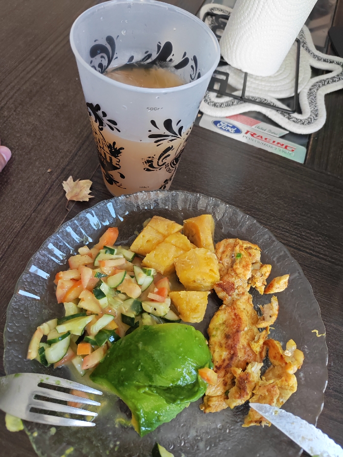 A close-up, overhead shot captured in La Plata, Argentina, depicts a meal served on a dark brown wooden surface. A clear, textured glass plate occupies the lower-center, holding a portion of cooked chicken pieces, diced plantains, a cucumber and tomato salad with dressing, and a halved avocado. A silver-colored metal fork rests on the plate's lower-left edge, and a silver-colored metal knife with a serrated blade is visible on the lower-right. Above the plate, a translucent white plastic cup with black swirl patterns contains a light amber liquid, with "500cc" and "200cc" markings visible. To the left of the cup, a small, dried light brown leaf lies on the surface. In the upper-right background, a roll of white paper towels on a black metal holder rests on a white, star-shaped woven placemat. Partially visible beneath the placemat is a magazine or brochure featuring the "Ford" logo and the text "RACING PERFORMANCE PARTS."