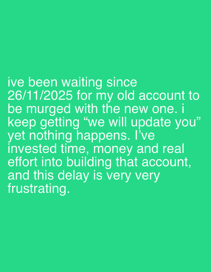 The image displays a text message on a green background. The sender expresses frustration over a delayed account merger, stating they have been waiting since November 26, 2025. They are dissatisfied with generic updates and emphasize the time, money, and effort invested in building the old account. The sender conveys that the ongoing delay is extremely frustrating.