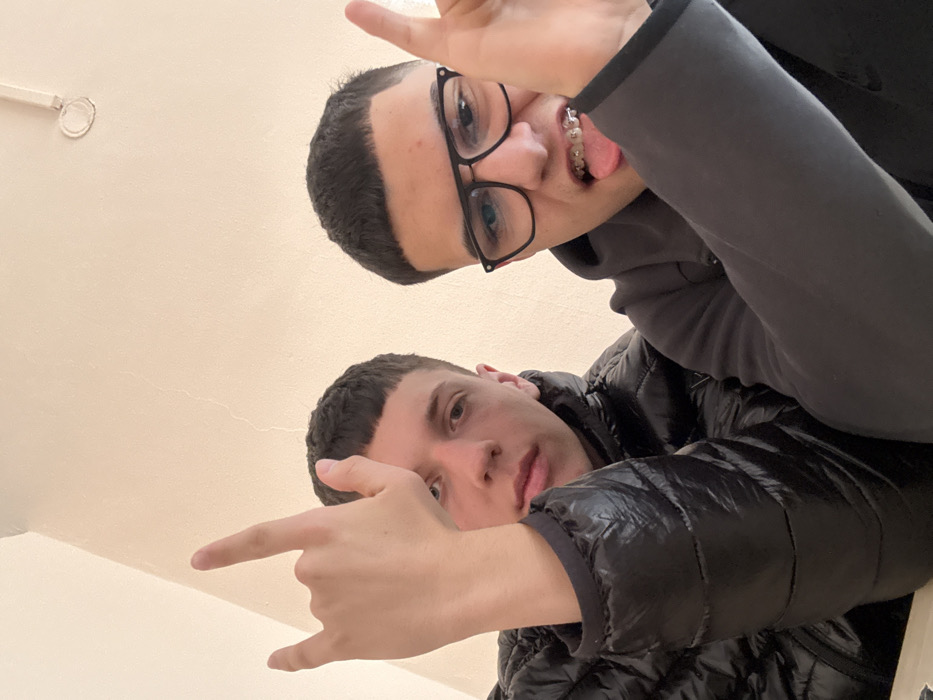The image depicts two young adult males positioned closely together in an indoor setting. The individual on the left, foreground, has short dark hair with a straight fringe and wears a black, quilted puffer jacket. His right hand is raised to head level, forming a gesture with the thumb, index, and pinky fingers extended. He looks directly forward with a neutral expression. The individual on the right, partially behind the first, also has short dark hair with a straight fringe. He wears black-framed glasses and exhibits dental braces on his upper teeth. He is dressed in a dark grey hooded sweatshirt. His right hand is partially raised, with the thumb extended, and his tongue is slightly protruded, accompanied by an expressive grimace as he looks towards the camera. The background consists of a plain, light beige or off-white wall. A minor, light-colored fixture is visible on the wall in the upper right quadrant. No specific architectural or environmental markers are present within the image to ascertain its precise location within Pravets, Bulgaria.