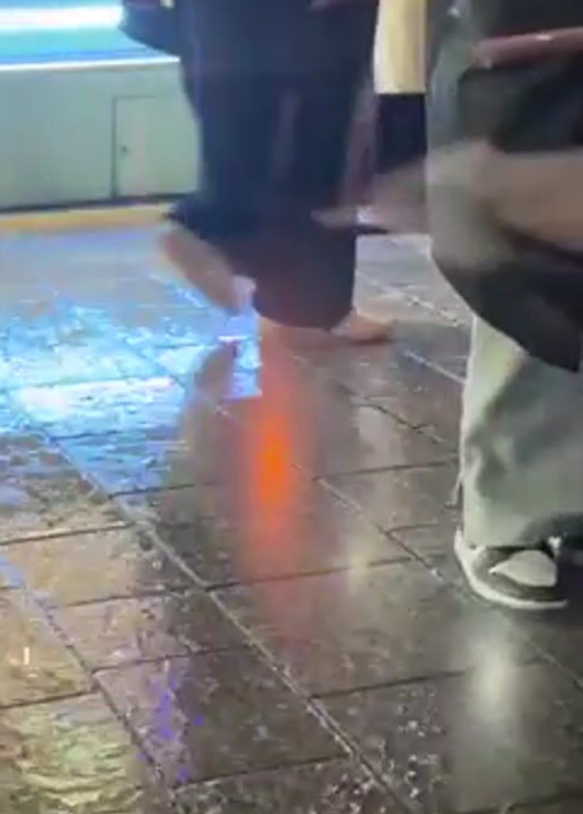 The video depicts a wet, tiled outdoor walkway at night, reflecting light in blue, orange, and white