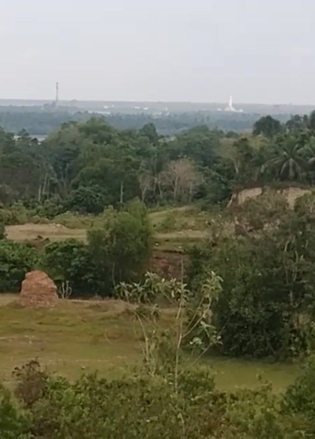 distant, slightly hazy landscape dominated by dense, green vegetation. In the foreground, there's a grassy area with shrubs and a large, reddish-brown rock. Beyond that, a thick forest covers much of the view. A narrow dirt path can be seen winding through a clearing in the forest. In the far distance, the skyline is slightly visible, with what appears to be a tall white structure and a radio tower faintly discernible through the haze. The perspective suggests the video was shot from an elevated position. The camera is stable. The video is oriented vertically.