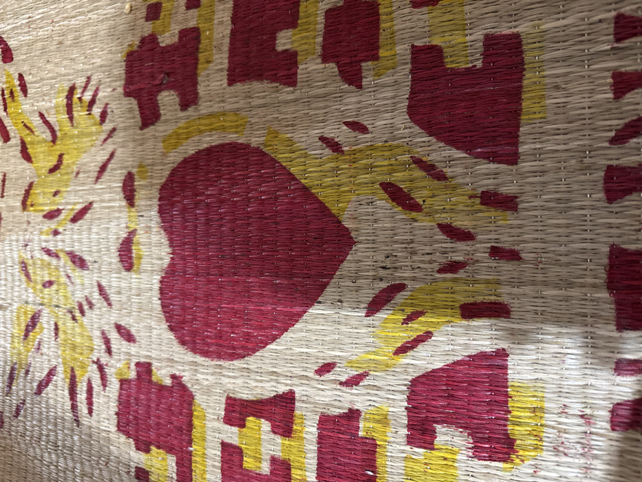 A close-up, overhead view displays a light-beige woven mat with a patterned design in red and yellow, observed in Ko H'Neh, Vietnam. Centrally, a large red heart is depicted. Below and to the sides of the heart are stylized yellow shapes resembling cupped hands or supporting elements, with additional yellow and red abstract shapes above, suggestive of wings or radiating energy. Blocky red letters with yellow outlines are positioned around the central heart, forming the word "LOVE"; specifically, the letter "E" is visible to the left, and the letter "V" is visible to the right. The mat exhibits a distinct horizontal and vertical weave, showing minor textural variations. No individuals, actions, or further environmental context beyond the mat itself are visible within the frame.