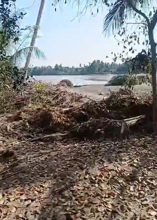 rural area, possibly a coastal village, with signs of debris and potential flooding. There are trees, including palm trees, and a body of water is visible in the background. The ground is covered with leaves and some scattered debris. There is also a view of a small building, likely a house, that seems to be in an elevated position, possibly due to the surrounding land being affected by water or debris.
