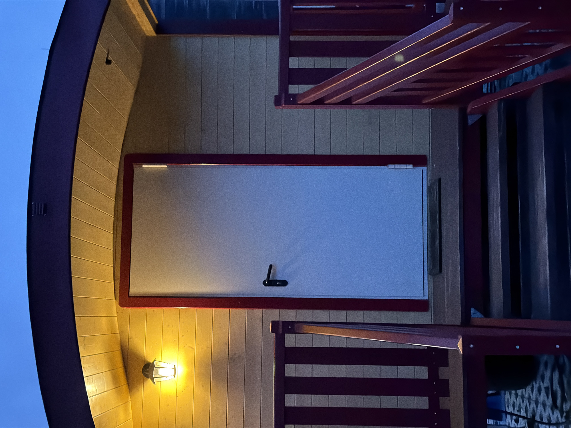 The image depicts the illuminated entrance of a rounded-roof structure located in Schifflange, Luxembourg, under twilight or nighttime conditions. The structure's facade is composed of light beige horizontal wooden siding, capped by a dark blue, arched roof. A white, flat-panel door, equipped with a black horizontal lever handle, is centrally positioned and outlined by dark red-maroon trim. To the left of the door, a single wall-mounted lantern-style fixture emits a warm, amber light, illuminating the immediate area. A dark doormat rests on the wooden porch directly in front of the door. Dark red-maroon wooden railings with vertical balusters flank a series of wooden steps leading up to the porch on both sides. A small, dark cylindrical object is visible mounted beneath the roof overhang to the upper right of the door. The sky above is a clear, deep blue. No individuals are present.