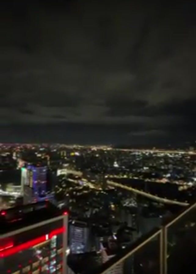 nighttime panorama of a city skyline from a high vantage point, likely a rooftop or high-rise balcony. Numerous buildings with illuminated windows and various colorful lights punctuate the cityscape, sprawling out towards the horizon under a cloudy night sky. Prominent structures include skyscrapers with distinctive lighting patterns. The camera slowly pans, offering a broader view of the urban landscape and capturing the movement of traffic along major roads. A glass railing is visible in the foreground, marking the edge of the viewing platform.