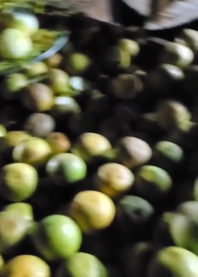 nighttime street scene. It starts with a focus on a pile of green and yellow fruits, some displayed on a metal tray with leafy green bedding. The camera then moves to capture a group of people gathered on a dirt surface near a concrete curb or ditch. It then passes through a dimly lit, cluttered interior space, before returning to the street. People are visible walking by, and a red vending machine-like object stands near the roadside. The lighting is poor throughout the video.