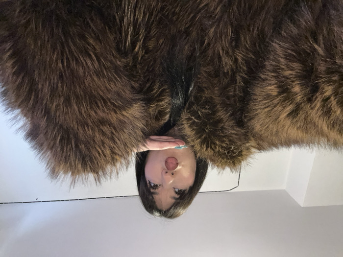 A female individual is depicted in a close-up, indoor portrait. She has dark hair with bangs and is looking upwards and to her right. Her lips are pursed, and her right hand, with turquoise-painted fingernails, rests with its palm under her chin. She is wearing a bulky, dark brown, long-pile faux fur garment that fills the lower and central portion of the frame. The background consists of a plain white wall and ceiling, with a faint horizontal line and a string of dark, small objects visible against the wall in the upper right. The scene takes place within an unspecified interior location in Strasbourg, France.