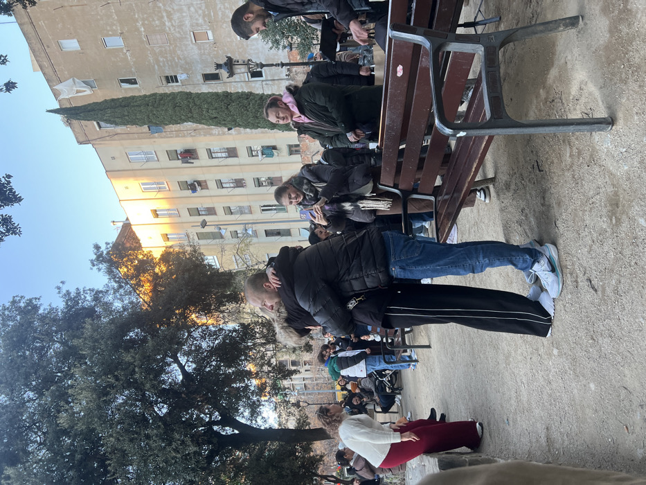 A group of people gather in a park setting, some sitting on benches. One couple stands, embracing. Others are seated, with some appearing to hold beverages. The backdrop features an aged building and tall, slender trees, suggesting an urban park environment. Sunlight filters through the trees, casting shadows on the ground. The scene has a casual, relaxed atmosphere.