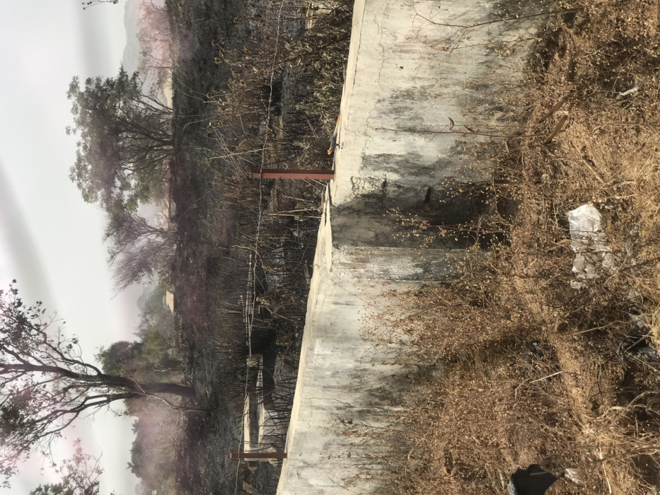 The scene depicts an outdoor landscape in the city of New Stadium, Nigeria, characterized by significant evidence of a recent burn. In the foreground, dry, light-brown vegetation, primarily weeds and grasses, covers the ground, interspersed with white and black plastic litter. A weathered concrete retaining wall, exhibiting cracks and dark discoloration, runs horizontally across the midground. Mounted on the top of this wall are two reddish-brown metal posts connected by strands of barbed wire, forming a barrier. A small lizard with an orange head and yellowish-brown body is observed positioned on the concrete wall near the rightmost fence post. Immediately behind the wall, the terrain is covered with charred, blackened vegetation and bare ground, indicative of a fire. Skeletal remains of small shrubs and grasses are visible in this burned area. Further in the background, healthier trees with green foliage stand among partially burned or recovering vegetation. Distant hills or mountains are faintly visible under a hazy, bright sky, along with some light-colored structures, possibly buildings, nestled within the landscape. No human figures are present.