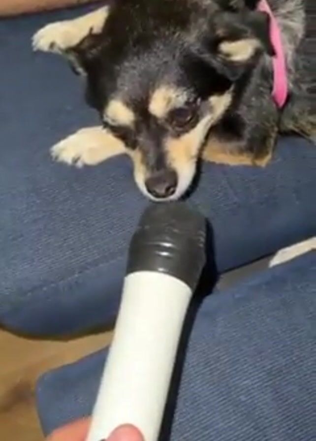A young man sits on a blue upholstered couch, holding a white microphone in his right hand. A small black and tan dog with a pink collar is lying on the couch next to him. The man briefly looks at the camera while holding the microphone towards the dog. The background is blurred, showing a glimpse of light-colored wooden flooring.