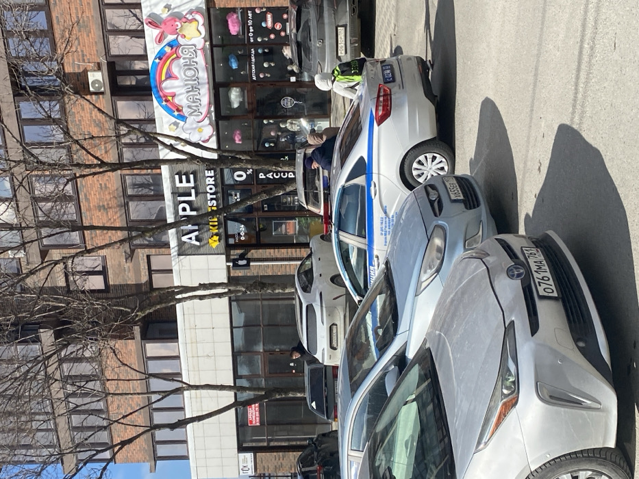 The image displays an outdoor street scene in Anapa, Russia, under bright daylight, indicated by distinct shadows. The view is partially obstructed by the bare branches of several deciduous trees. In the foreground, a silver Toyota Prius (license plate 076 1MA 761) is parked, followed by a light blue Hyundai Accent (license plate X655EB 193). Behind the Hyundai is a white Russian police sedan (license plate C 029PA 93), identified by its blue stripe, roof-mounted light bar, and "ПОЛИЦИЯ" (POLICE) and "ОМВД России по г-к Анапа" markings on the side. Two individuals are visible near the police vehicle. One person, wearing a dark jacket, is positioned at the rear passenger door area of the police car. Another individual, wearing a light-colored jacket and a yellow or green high-visibility backpack, stands near the rear driver's side of the police car, facing away from the viewer. Further along the street, a dark gray SUV (license plate P061OP 193) is parked. To the left, a white SUV with an obscured rear license plate is also visible, with a person in a dark jacket standing near its rear. The background features a multi-story building constructed of reddish-brown brick with numerous windows. At street level, several commercial storefronts are present. A store named "APPLE KID STORE" with a yellow star graphic and "РАССРОЧКА 0-0-24" text is visible. Adjacent to it on the right is "МАЮНЯ," a children's store distinguished by a colorful rainbow, clouds, and a pink bunny graphic, with text indicating "ДЕТСКАЯ ОДЕЖДА от 0 до 10 ЛЕТ" (Children's clothing from 0 to 10 years). To the left of "APPLE KID STORE," a storefront displays an "АРЕНДА" (For Rent) sign in Russian. An external air conditioning unit is mounted on the brick facade above the stores.