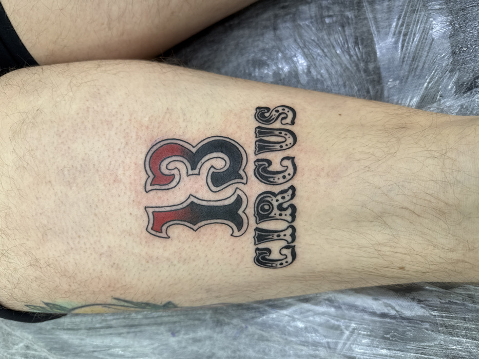 A close-up image shows a newly applied tattoo on the upper leg of an individual. The skin is light-toned and exhibits sparse hair follicles. The tattoo features the number "13" prominently, rendered in a stylized, bold font with a black outline. The interior of the numbers shows a gradient fill, transitioning from red at the top to black at the bottom. Below the number "13," the word "CIRCUS" is tattooed in a decorative, circus-marquee-style font. Each letter of "CIRCUS" is black with a white outline and contains internal patterns of dots and lines. To the left edge, a faint green and yellow design, possibly another tattoo or part of a fabric pattern, is partially visible. The upper right corner shows a sliver of dark fabric, likely clothing. The lower right portion of the image reveals a textured, reflective grey surface, consistent with a protective plastic covering. The specific location in the city of Moscow, Russia, is not discernible from the image.