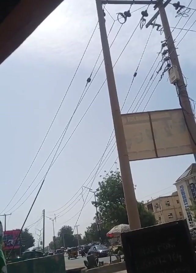 street scene in what appears to be a sunny, possibly urban, environment. There are power lines stretching across the sky, connected to utility poles. There's a sign mounted on one of the poles. Across the street, there are vehicles, including cars and a tricycle. Trees line the street and there are buildings in the background. A chalkboard with writing on it is partially visible in the foreground, and a roof overhang is also visible at the top of the frame, indicating the video is shot from an indoor location. The general impression is a busy street on a clear day.