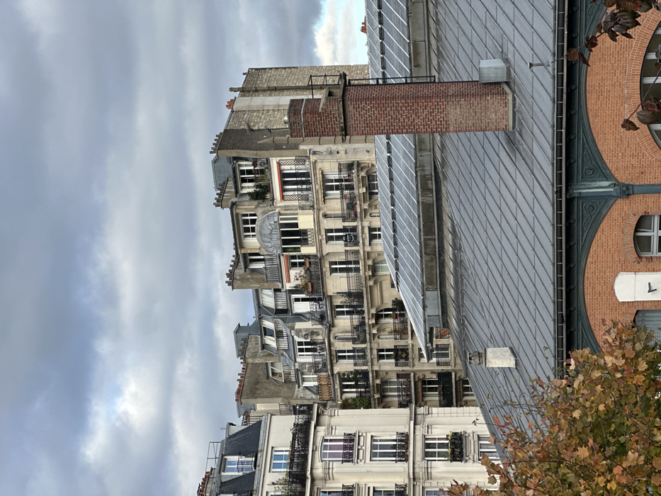 The image displays a detailed urban landscape in Paris, France, captured from an elevated perspective under an overcast sky. In the immediate foreground, autumnal tree branches with yellow, orange, and brown leaves partially obscure the lower portion of a distinctive building. This building features a red brick facade with arched windows and dark green ornate cast-iron structural elements integrated below a dark gray pitched metal roof. A prominent, tall red brick chimney stack rises from this roof. Behind and slightly above this structure, a lighter gray roof system with multiple glass panels is visible, suggesting a large skylight or solar array. The background is dominated by classic Parisian Haussmannian apartment buildings. These multi-story structures exhibit light-colored stone or stucco facades, multiple windows, and numerous balconies adorned with black wrought-iron railings. Some balconies contain potted plants. Architectural details include dormer windows set into dark gray zinc mansard roofs, and various chimney stacks. One particular building features a distinctive, multi-paneled curved glass enclosure on an upper floor, protruding from the facade. Another building section reveals a rough, un-rendered side wall. No people or specific actions are discernible within the frame. The architectural elements, particularly the combination of Haussmannian residential buildings and the industrial-era market hall structure with its brick, cast iron, and expansive roof, precisely identify the location as the area around the **Carreau du Temple** in the **3rd arrondissement of Paris**. The foreground brick building with ornate ironwork and the prominent roof structure is consistent with the Carreau du Temple itself, viewed from a nearby vantage point.