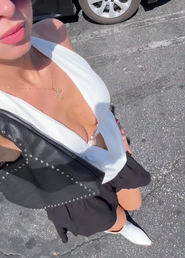 A person, presumably female, stands in an outdoor parking lot next to a black car. They are wearing a white low-cut halter top, a short black skirt, and white boots. A black purse with studs hangs from their shoulder. The person is wearing sunglasses and has pink lipstick on. The parking lot is gray asphalt. The sun appears to be shining brightly.