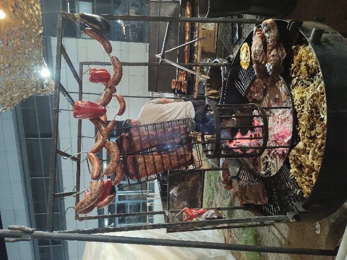 - "A large, rotating grill with meat and vegetables, including sausages, peppers, eggplant, steaks, and onions, is being used" by FM-pTpdg1, licensed under CC BY 4.0