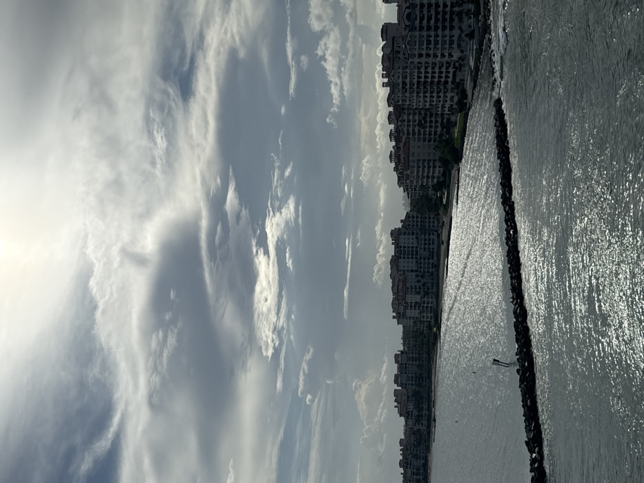 The image displays a coastal panorama identified as the waterfront of Fisher Island, Miami-Dade County, viewed from the Government Cut channel in Miami Beach, United States. The upper half of the frame is occupied by a partly cloudy sky, featuring a bright, diffused light source, presumably the sun, in the upper-right quadrant. The lower half depicts a body of water with extensive surface glare and shimmering reflections. Along the horizon, a continuous line of multi-story residential buildings, characteristic of condominiums on Fisher Island, are visible. These structures feature light-colored exteriors and dark, possibly terracotta-tiled roofs, appearing partially shadowed against the water and sky. A prominent dark, rocky breakwater extends horizontally into the water from the right mid-ground, showing wave interaction on its seaward side. A single white and black navigational marker stands vertically in the water near the breakwater. No people are discernible in the scene. The overall environment suggests a sunny, yet partly overcast day.