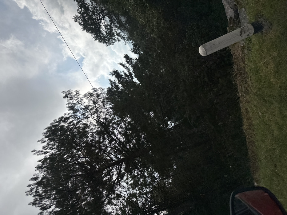 A low-angle shot captures a cloudy sky peeking through trees. A singular power line cuts across the upper left. Overhanging greenery dominates the view, obscuring light. A cylindrical object sits on the right edge, atop a patch of green grass. The bottom right reveals part of a vehicle side mirror. The scene evokes a sense of being hemmed in by nature.