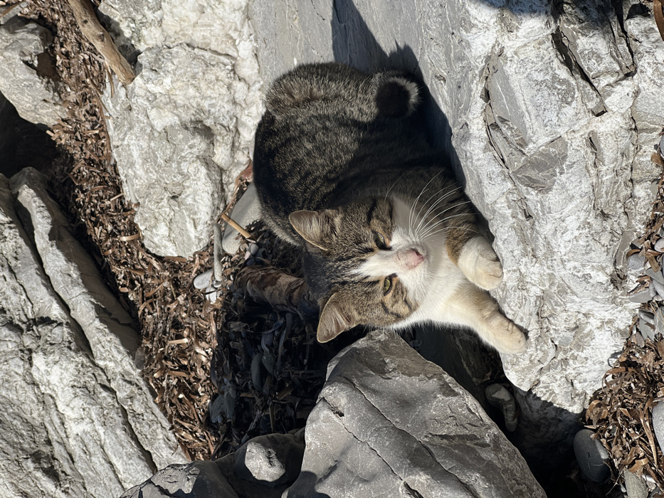 A tabby and white cat is observed resting on light grey rocks under direct sunlight in Zagrađe, Montenegro