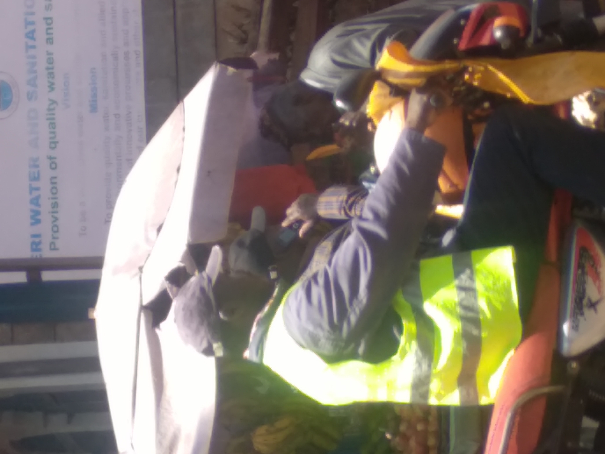 man in a yellow safety vest sitting on a vehicle of sorts, possibly a cart or modified motorcycle, in Nyeri, Kenya. He is wearing a cap and appears to be using a mobile phone. Behind the man is a sign for "ERI WATER AND SANITATION" with a mission statement about quality water. The environment appears to be a street scene, with other people and objects partially visible in the background. There are bananas and nuts or seeds in front of him.