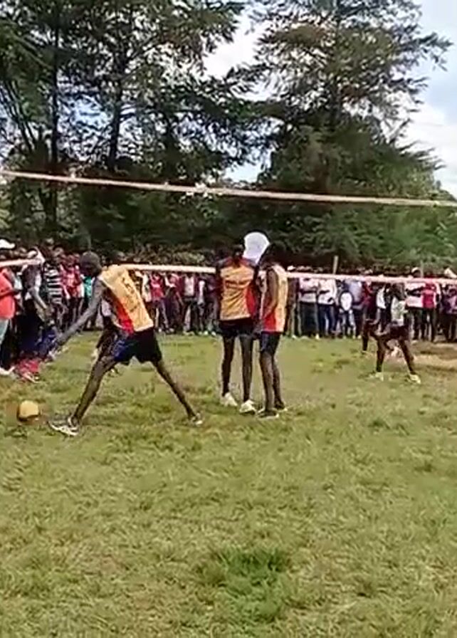 A volleyball game is in progress on a grassy field. Two teams wearing matching jerseys are playing, with spectators lining both sides of the court. The jerseys are yellow and red, and some players have numbers on their backs. The volleyball net appears homemade, constructed with wooden poles and twine. There are trees in the background, and the sky is cloudy. The spectators are a mix of men, women, and children, dressed in casual clothing. The players are interacting as they try to hit the volleyball over the net.